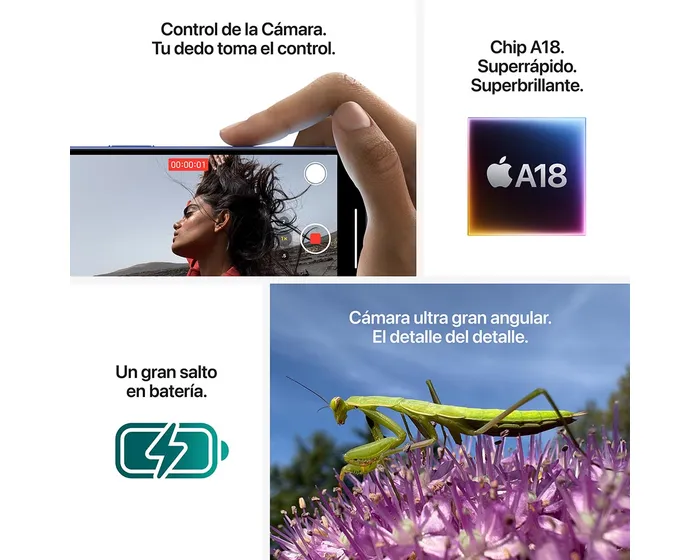 Procesador: Apple A18 Bionic (6 núcleos: 2x rendimiento + 4x eficiencia)